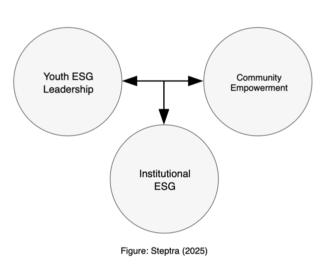 ESG frameworks aim to reshape how organizations, communities, and systems create sustainable value. The Steptra approach is rely on active interaction between Youth ESG Leadership, Community Empowerment and Institutional ESG as describe in the following figure,